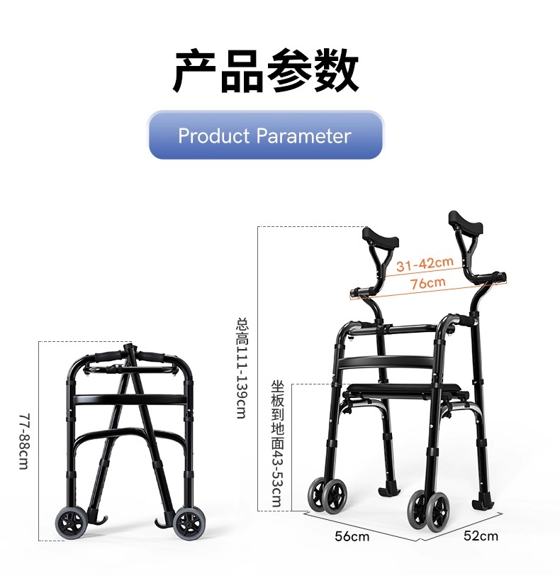 特點:軟質腋托:無需要彎腰、結實耐用;一鍵折疊:不占空間、便于收納;高度可調:適合不同身高人群使用。可翻坐板:累了可隨時休息。